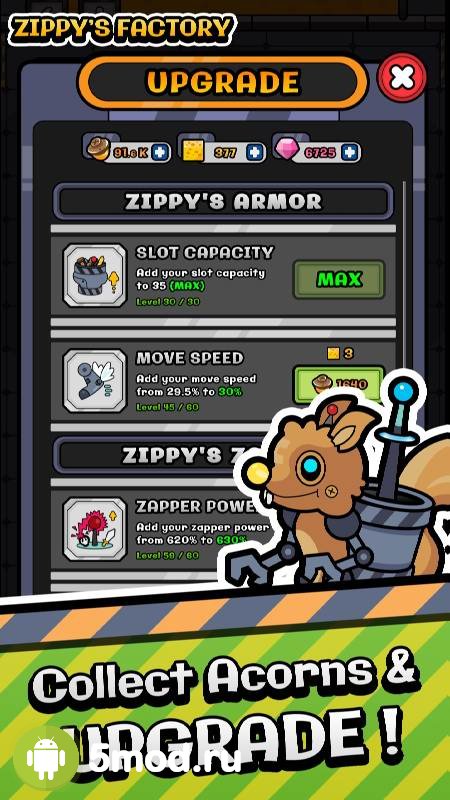 Zippy's Factory - Idle RPG - экшен-рогалик в котором игроки получат роль белки-киборга. События происходят на просторах огромного промышленного комплекса, что в автоматическом режиме производит запчасти для роботов, а так же проводит сборку. Появление нарушителя и носителя органической плоти запускает сигнал тревоги. Охранники начинают безжалостную охоту, но персонаж способен постоять за себя. Геймеры будут отбивать нападения, уничтожать врагов, собирать трофеи, искать ресурсы, улучшать навыки и характеристики, а так же устанавливать дополнительные модули. Которые выведут боевые способности на совершенно новый уровень.