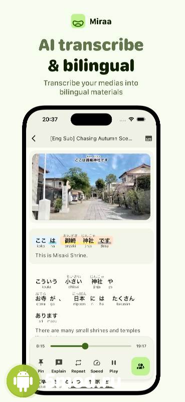 Miraa - AI transcribe & study - отличная находка для людей занявшихся самостоятельным изучением иностранных языков. Программа предлагает использовать искусственный интеллект для беспроблемного перевода нужного пользователю материала. Аудио, текст, субтитры в ролике, сам звук в видео и так далее. И всё это в реальном времени. Что помогает процессу и не требует раздражающего ожидания. Есть и ряд дополнительных функций и инструментов для того, чтобы обучение был разносторонним и максимально полезным для ученика. Эти и многие другие факторы и сделали приложение популярным выбором себе в помощники для более лёгкого достижения желаемого.