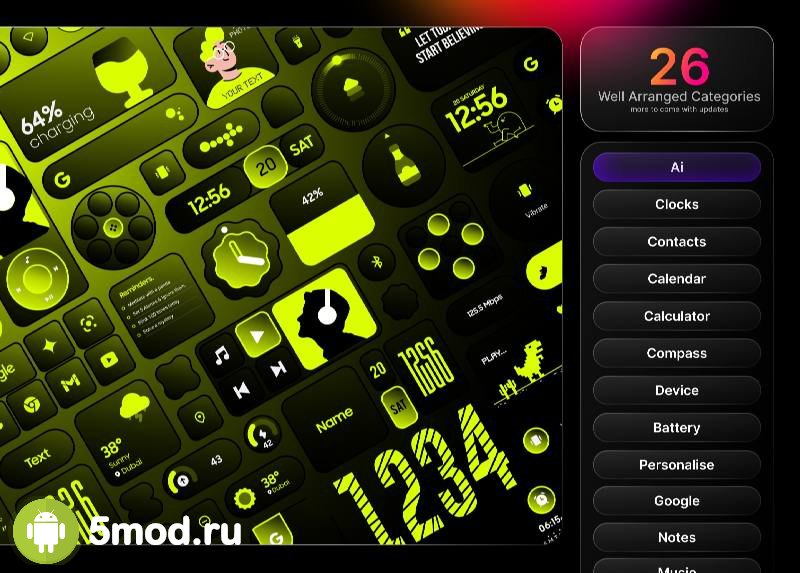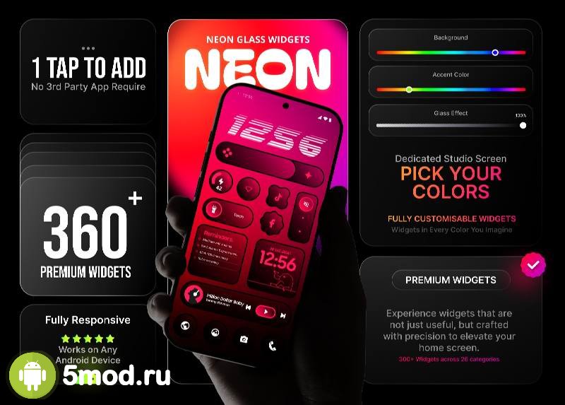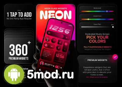 Neon Glass Widgets - шикарная находка для желающих персонализировать рабочий стол мобильного устройства с помощью красивых, стильных, качественно проработанных и функциональных виджетов. Есть и масса дополнительных материалов и элементов, что так же могут стать полезным украшением в указанном месте экрана. Ну, а факто того, что для установки не требуется ничего дополнительного в виде фундамента так же добавляет положительных впечатлений от этой коллекции. Масштабы, разнообразие, оригинальность, регулярные обновления и улучшения сделали подборку одним из лучших вариантов в своём сегменте приложений.