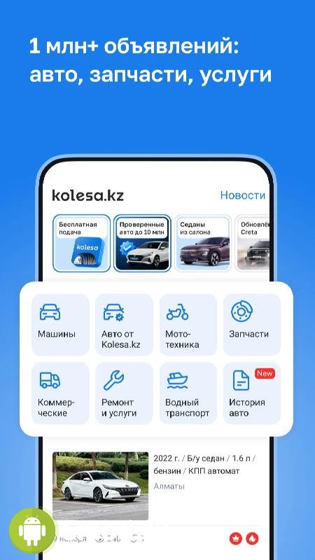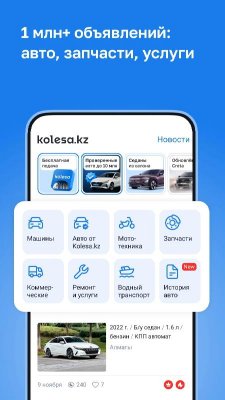 Kolesa.kz — авто объявления - приложение для автовладельцев или желающих ими стать преимущественно на просторах Казахстана. Проект помогает в купле-продаже, поиске оригинальных запчастей, отслеживать актуальные цены, искать автомобили с оптимальным пробегом и так далее. Удобный поиск, формы создания объявлений, система оповещений и прочие факторы обеспечивают желаемый положительный результат. Ну, а учитывая популярность программы ничего удивительного в том, что количество выставленных лотов на продажу более чем впечатляет. Так что желающим подобрать для себя подходящий вариант точно стоит обратить внимание на проект.