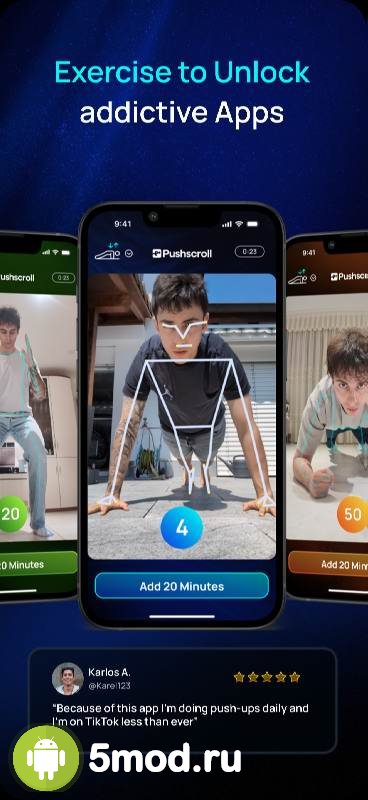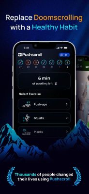 Pushscroll: Screen-Time Gym - весьма нестандартный и оригинальный проект в серии ПО для блокировки прокрутки социальных сетей и видеохостингов с короткими роликами. Приложение не просто устраняет возможность таких действий для постепенно избавления от зависимости. Он предлагает торговые отношения. Отжимания в обмен на время скроллинга. Это одновременно положительно сказывается на физической форме и помогает осмысленно тратить время на видео. Механизм считывания обеспечивает точность подсчёта. Ну, а разработчики обещают добавить в список и иные упражнения для всесторонней разминки мышц пользователей.